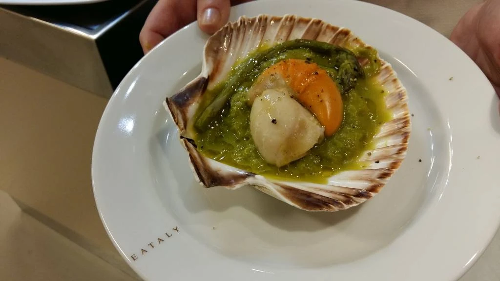Nella conchiglia della capasanta mettere prima la crema di asparagi e sopra una capasanta e terminare con una macinata di pepe, sale e un filo di olio crudo.