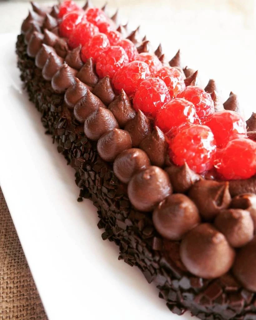 MONTAGGIO: Sopra al biscotto fare tanti ciuffetti di cremoso al cioccolato e terminare con i lamponi