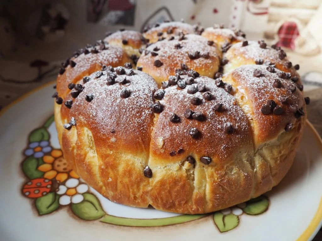 Impastare fino ad ottenere un impasto omogeneo e morbido. Ponete l’impasto in una ciotola e lasciar lievitare per un paio di ore o comunque fino al raddoppio. Ricavare nove palline da 100 gr e disporle in una teglia di diametro 24 cm, coprire con un panno e lasciare lievitare bene almeno per circa 3 ore. Prima di infornare spennellare con l’emulsione di albumi e zucchero a velo. Cospargere di gocce di cioccolato o granella di zucchero.