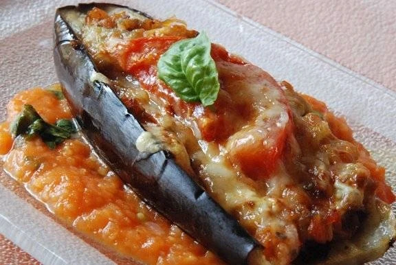 Riempire con il ripieno la melanzana svuotata e aggiungere sopra un pò di salsa di pomodoro e una foglia di basilico.