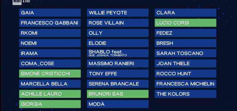 9 Canzoni Giorgia – La cura di te Lucio Corsi – Volevo essere un duro Gaia – Chiamo io chiami tu Serena Brancale – Anema e core Elodie – Dimenticarsi alle 7 The Kolors – Tu con chi fai l’amore Rocco Hunt – Mille volta ancora Coma Cosa – Cuoricini Olly – Balorda nostalgia