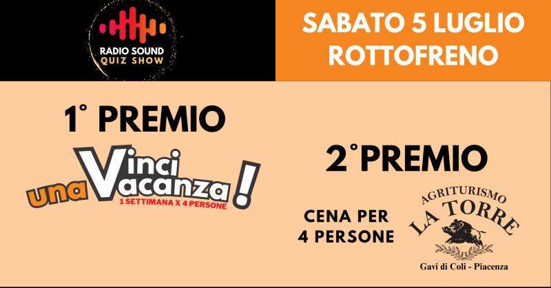 | Sabato 5 luglio 1° Premio: Vacanza x 4 persone 2° Premio: Cena per 4 persone presso Agriturismo La Torre – Gavi di Coli – Piacenza Scopri | Rottofreno (Pc) Via Papa Giovanni XXIII | |