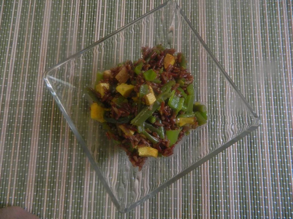 Prendere i fagiolini tagliarli a tocchetti ed unirli alle altre verdure; cuocere il riso e scolarlo. Unire il tutto, saltare per qualche minuto aggiungendo la salsa di soia.