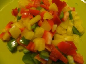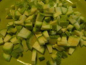 Lavare e tagliare a dadini le verdure, far soffriggere con un cucchiaio di olio il trito di scalogno per 8 minuti a fiamma viva.