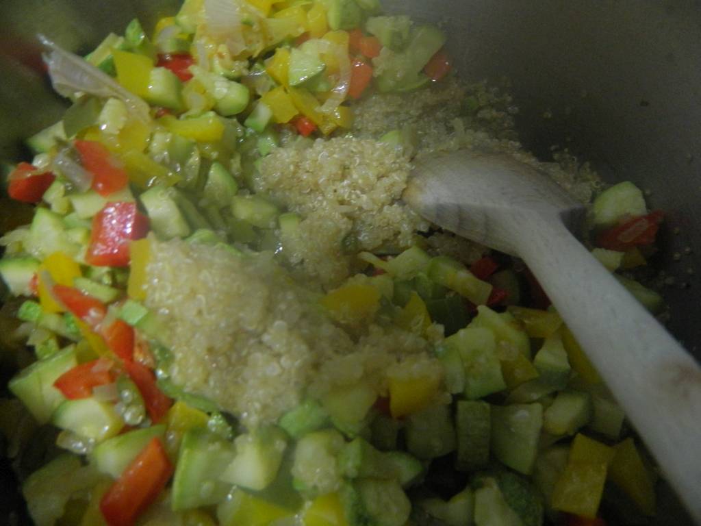 Lavare la quinoa e scolarla con colino a maglie strette, metterla in pentola con il brodo e far cuocere con coperchio per 15/20 minuti a fuoco basso.