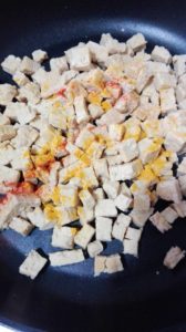 Portare a bollore l’acqua, nel frattempo tagliare il tempeh a dadini piccoli e saltare con olio, pimento e curcuma per qualche minuto, aggiungete la passata di pomodoro e cuocere per 10 minuti a fuoco basso.