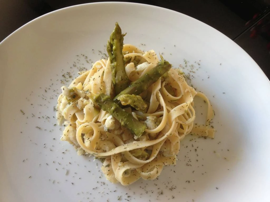 Far appassire lo scalogno e l’aglio schiacciato con un po’ di acqua e olio. Aggiungete gli asparagi, mondati e tagliati a tocchetti, una manciata di prezzemolo sale e pepe. Coperchiate e lasciate stufare a fiamma bassa per circa 15 minuti, avendo cura di mescolare delicatamente di tanto in tanto e aggiungere acqua se necessario. Spostate gli asparagi, già cotti, su un piatto e lasciate, nella terrina, il condimento che servirà per cuocere il pesce, precedentemente tagliato a pezzi. Aggiungere sale, pepe aneto e se necessario altra acqua o brodo di pesce (ma poco per volta.) Cuocere per 10 minuti circa a tegame coperto. A parte cuocete le tagliatelle in abbondante acqua salata. Scolate al dente e conditele con il ragu di pesce e asparagi. Completate con una generosa spolverata di Aneto e un filo di olio. Servite ben calde.